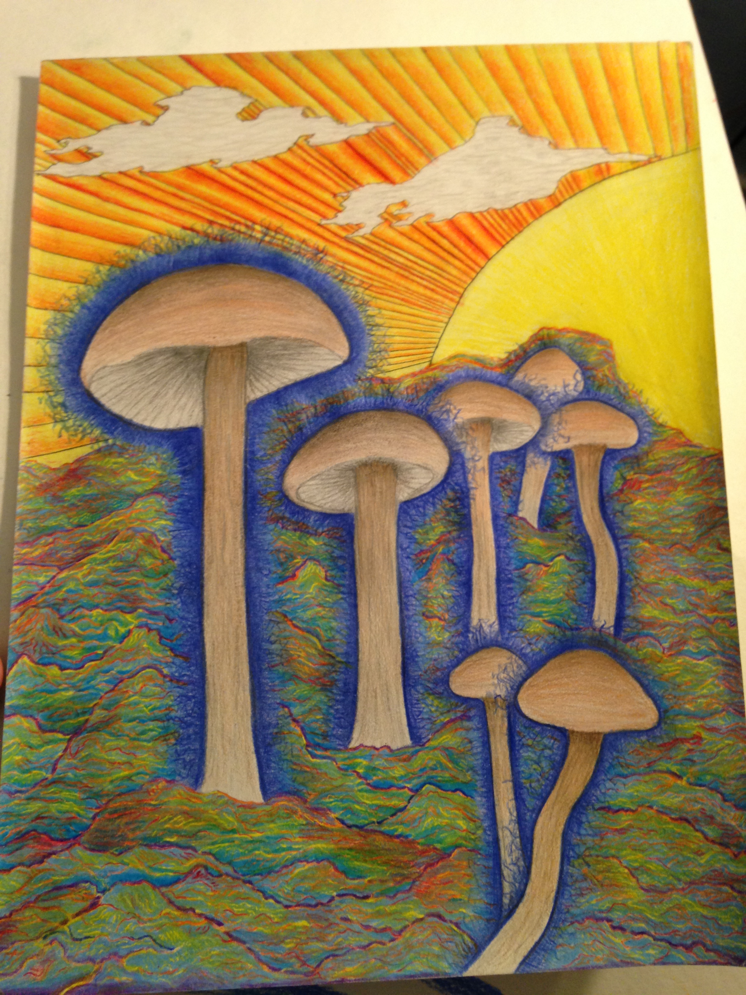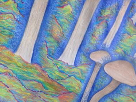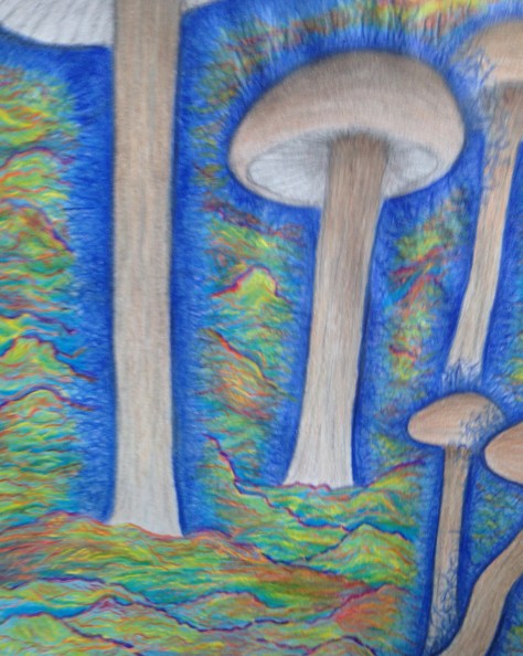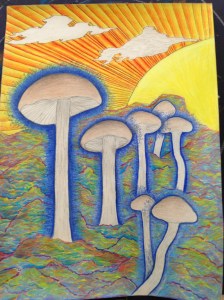 I decide to give the mushrooms the appearance of emanating energy, choosing the form of a blue electricity. I also decide I’m going to make the mountains look very colorful and try to create the illusion of iridescence as well as add a lot more detail. Lastly I decide to make the sky look like its attached to the clouds as if the sky and clouds were some kind of technological mechanism.  I erase some of the graphite surrounding my mushroom outline, this allows space for the electric looking effect. I add in the blue electricity, color in the sky, and do a little of the shading on the mushroom caps to keep color from the mountains I’m going to shade later from overlapping onto the caps. What I have at this point looks like this:
