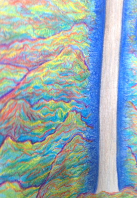 I decide the on my color scheme for the mountains and get to work. This part took the longest. All the outline had to be erased and replaced with a colored pencil outline. This new outline was also multicolored and I blended the colors red, yellow, green, and blue together to create it. I decide to fill the mountains with the blue color.