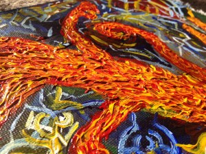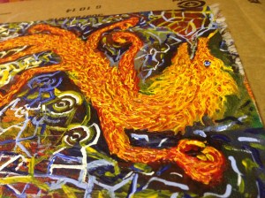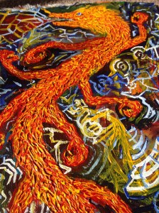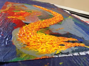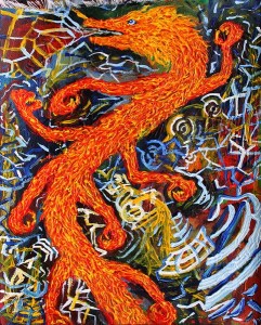 I didn’t start the painting with the intention of making a flaming serpent. I just went for it. Eventually I had a shape that resembled the body of a snake. When that idea came up, it rooted in my mind and by then I had my specific intention set.