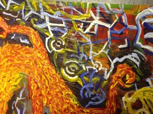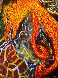 I didn’t care about making mistakes or creating something realistic or impressive. I started by painting the body of the serpent, then the head. When painting the body I used extremely thick and copious amounts of paint. This created a very interesting texture effect, making it appear as though the “scales” of the serpent were rising out of the painting.